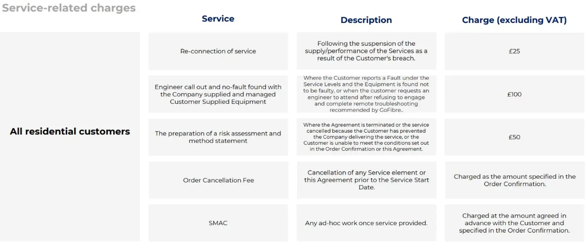 The early termination charge is calculated using the remaining months of the contract, Fibre/Fibre add ons monthly cost (including any promotional offers and minus the cost of GoFibre not providing the service.